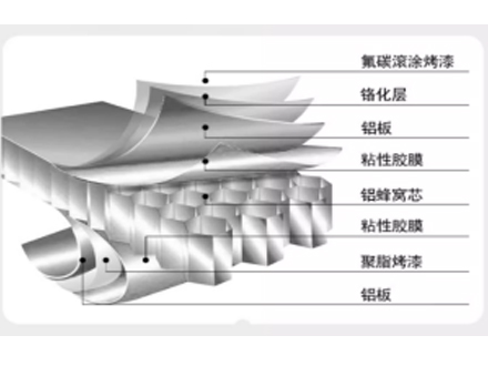 铝蜂窝板是采用经氟碳喷涂处理的耐候性极佳的高强度合金铝板作为面、底板,中间是铝蜂窝芯,经高温复